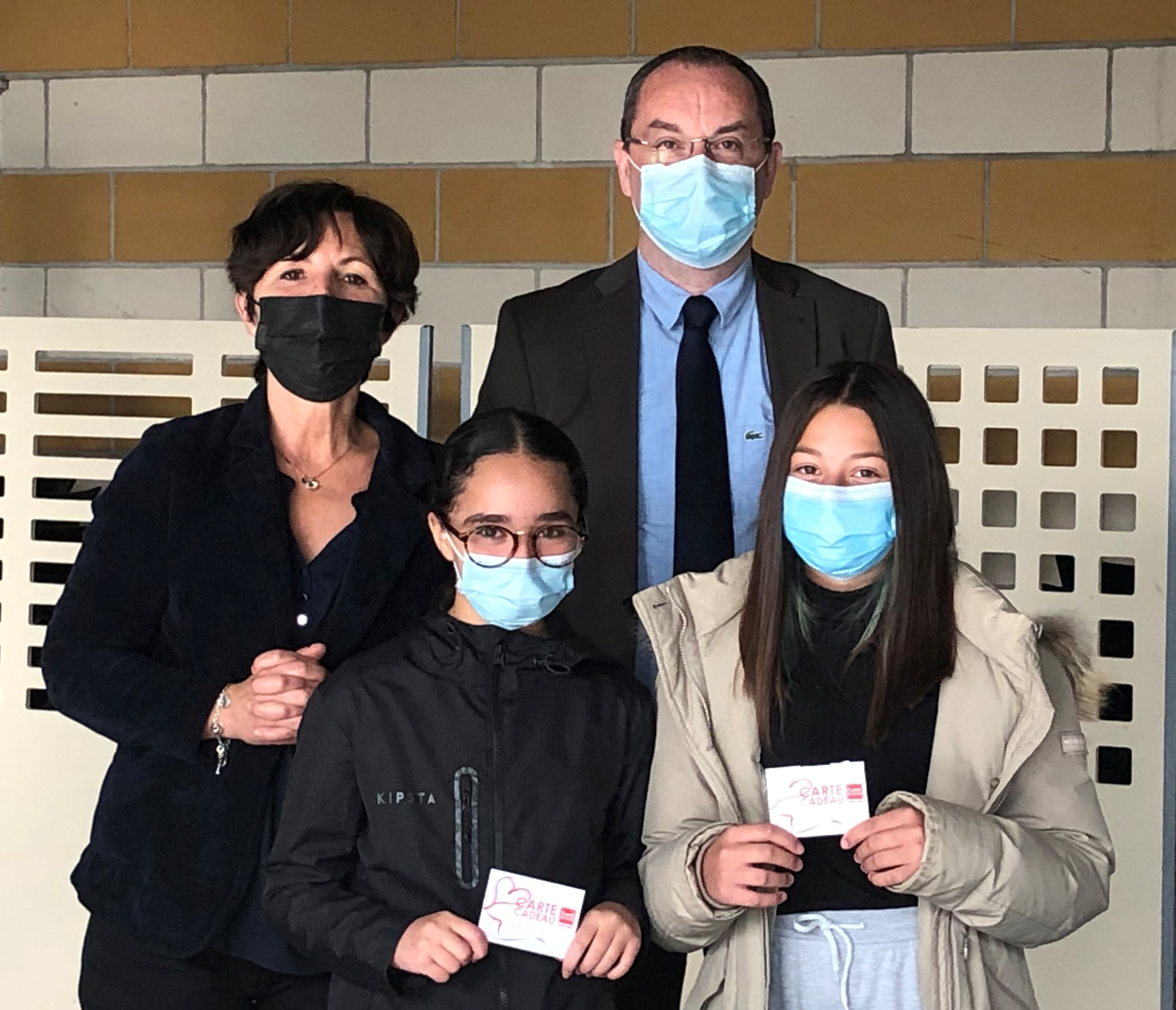Inesse F. et Ceren C., les deux finalistes de 6ème B, accompagnées de M.Marecaux, principal adjoint, et de leur professeure de français, Mme Tricot.