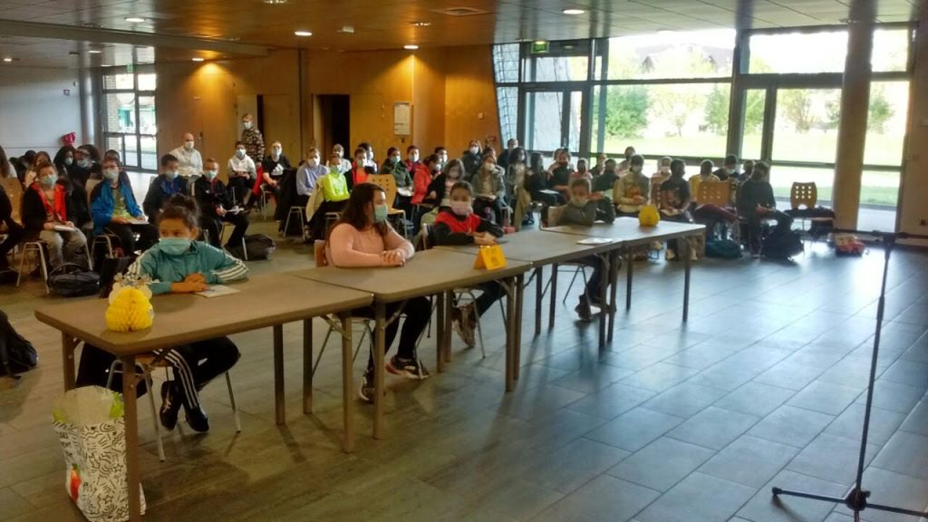 Sauriez-vous épeler de mémoire, sans vous tromper, des mots comme « parallélogramme« , « étymologie« , « métaphore » ou « méditerranéenne » ? En n’oubliant aucun accent bien sûr… C’est ce à quoi se sont entraînés les mêmes élèves de 6ème du Collège Jules Verne de Grande Synthe sur la même période. Debout, chacune, chacun derrière sa chaise, concentré(e), on dit le mot, on l’épelle, on le dit à nouveau. Ou comment mémoriser l’orthographe des mots de façon ludique. Et efficace. Les mots dont il faut mémoriser l’orthographe appartiennent au vocabulaire que tout élève de 6ème doit connaître dans les différentes matières qui lui sont enseignées : l’histoire géo a son « planisphère », le français son « étymologie » et les maths leur « parallélépipède ». 8 champions et championnes (2 par classe) se sont affrontés le lundi 18 octobre à l’Atrium.