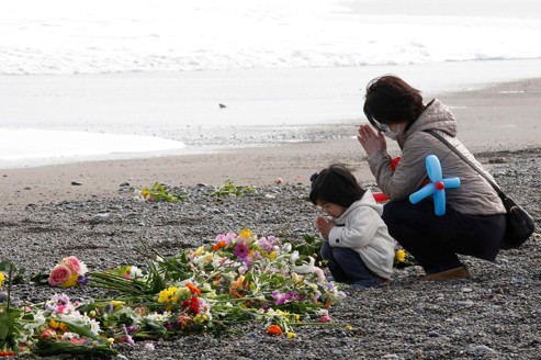 A mother and her daughter offer prayers for victims of the March 11, 2011 earthquake and tsunami disaster at a seaside which was damaged by the disaster in Iwaki, Fukushima prefecture, March 11, 2012, to mark the first anniversary of the earthquake and tsunami that killed thousands and set off a nuclear crisis. REUTERS/Kim Kyung-Hoon (JAPAN - Tags: ANNIVERSARY DISASTER)