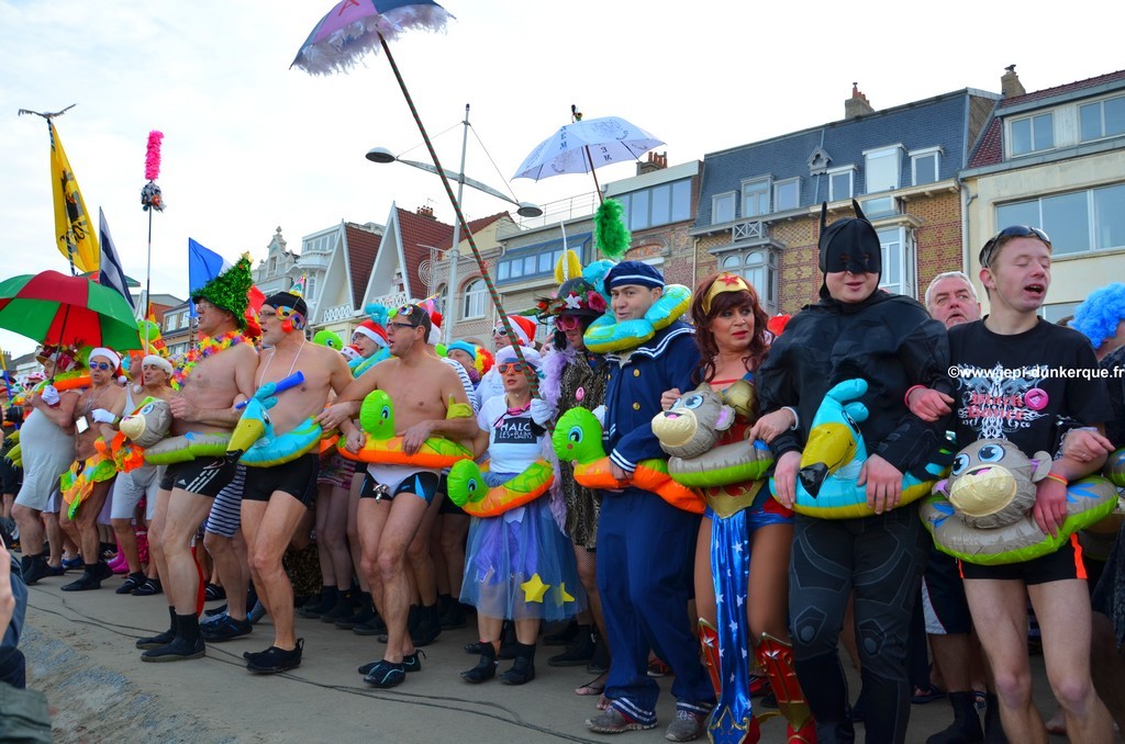 Un petit air de carnaval dunkerquois envahit la plage de Malo chaque 1er janvier depuis 15 ans déjà. : c’est le Bain des Givrés !